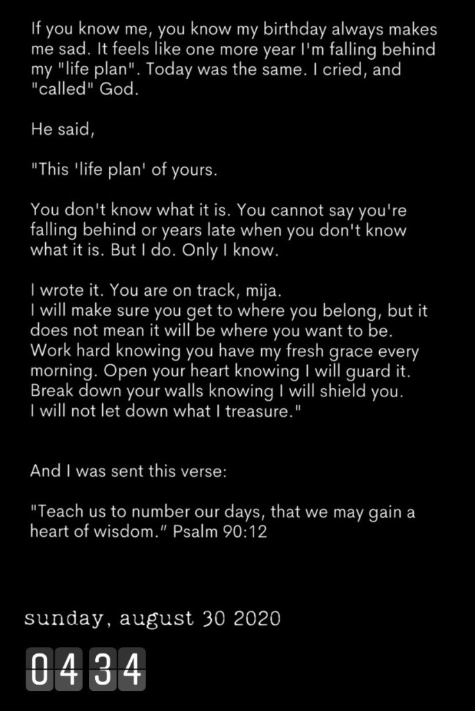 Or so I thought. On the eve of my birthday, God spoke to me. Most people instantly furrow their eyebrows at this. How does God speak to someone? And He does it in many ways. I have spoken to others who felt God in a myriad of ways. From a gust of wind, the start of rain, a corporeal voice, and many more. To me, this particular conversation was exchanged as clearly as if I were to read this aloud from a book. I cannot explain it as it was not a corporeal voice, but it did not only take place in my mind or my conscience. It truly was a little bit of both.